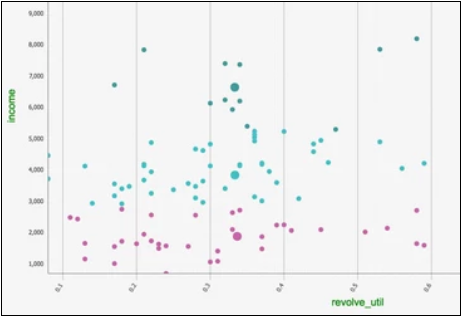 The output can only be displayed two dimensions at a time. Therefore, the modeler needs to review all the possible clustering diagrams in order to get an overall assessment of which attribute dimensions have the greatest influence on the clustering. Note: the Cluster Profiles results tab provides a quick sense of which variables have the most unique distribution profile across clusters, so those variables would be good ones to further analyze in this Cluster graph section.