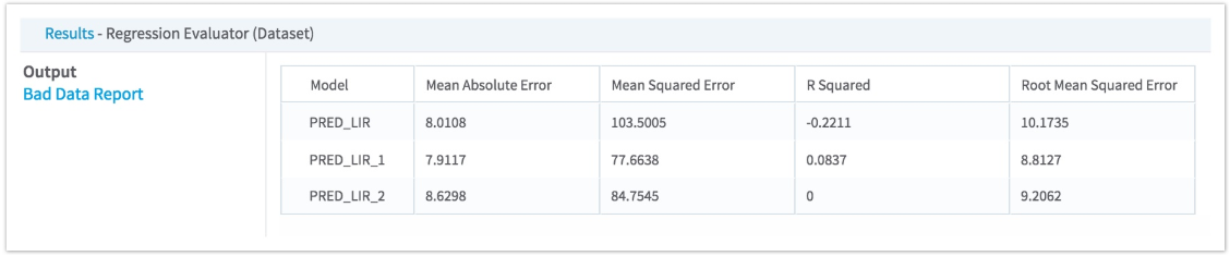 | Predicted Values (to Compare with Actual Value) | A set of numeric column(s) whose results predict the model. For example, if you are using this to evaluate several different linear regressions, the predicted values for each of the regressions is selected here. |
