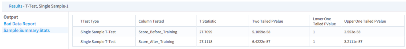 See Single Sample T-Test Use Case for example data on a puppy training program that illustrates use of the single sample t-test. In this case, we see that we have above average puppies since the Upper One Tailed PValue for the Score_Before_Training column is very close to zero, and that after training the puppies, they are still above average since the Upper One Tailed PValue for the Score_After_Training column is also close to zero.