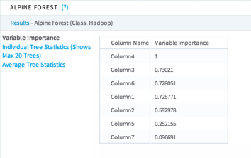 Note: The variable importance values are also stored as a CSV file in the following HDFS directory:@default_tempdir/tsds_model/@user_name/@flow_name/AlpineForest_<uniqueFlowRunID>/varImp.csv
