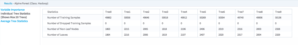 - Individual Tree Statistics - The Individual Tree Statistics (for up to 20 trees in the model) are displayed providing the number of training samples, dropped training samples, non-leaf nodes and number of leaves for each tree.