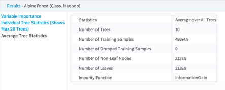 When run against Hadoop, the Alpine Forest Classification operator does not display the individual decision trees generated within the model because it is assumed that with large datasets the trees are much larger that can be displayed visually. Instead, summarizing statistics are presented.