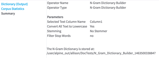 The data output of this operator is written to HDFS as a delimited file, but is not recognized by TIBCO Data Science – Team Studio as a tabular data set. This is because it is a special n-gram dictionary type that is only recognized by the Text Featurizer operator.
