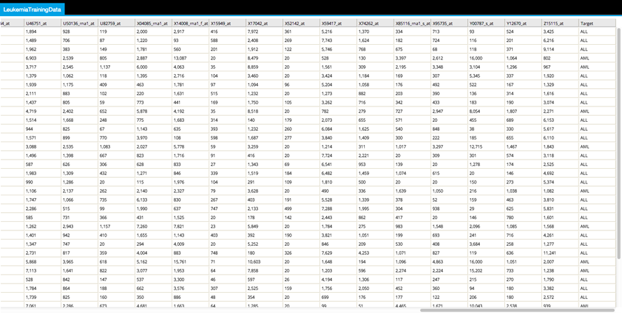 The source dataset for this use case is LeukemiaTrainingData.csv (9KB). Training biological leukemia gene dataset used in this use case was obtained from: http://research.cs.queensu.ca/home/xiao/dm.html.