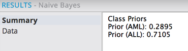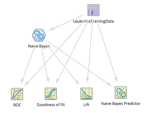 For this use case, a Naive Bayes model can be built from the training Naive Bayes Leukemia dataset by adding the Naive Bayes and Naive Bayes Prediction Operators in a new flow: