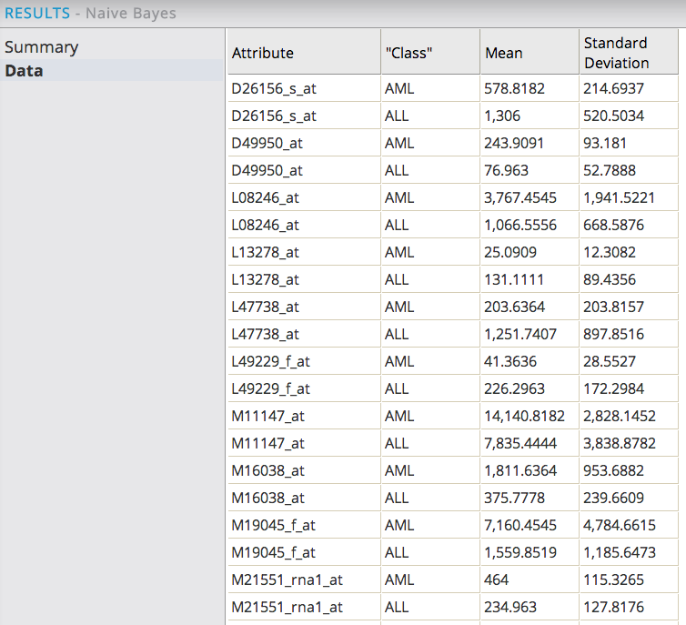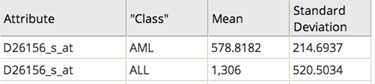 This data is helpful for understanding the measurement values that indicate the different classes of leukemia and for selecting the genes that are the most predictive of the type of Leukemia. For example, the D26156 gene attribute indicates AML class of leukemia when it has a value of 578 +/- 215, whereas it indicates ALL class of leukemia when it has a value of 1306 +/- 520.