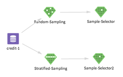 The third sampling operator, Sample Selector, follows either the Random Sampling or Stratified Sampling Operator to pass one of the generated sample datasets to succeeding operators in the workflow, as shown below.