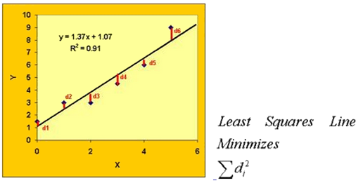 The following diagram depicts this concept of minimizing the squares of the deviations, d, of the data points from the linear regression.