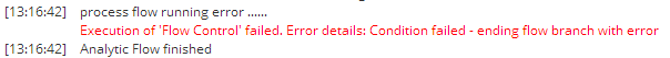 If Stop flow branch with error is set, the error appears in the log as follows: