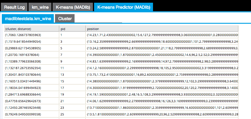 The first results tab in the following image shows the (cluster, distance) cluster assigned to each point and the distance between the point and the cluster centroid, the pid or point ID, and the position of the point itself.