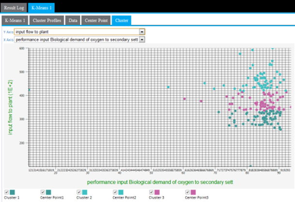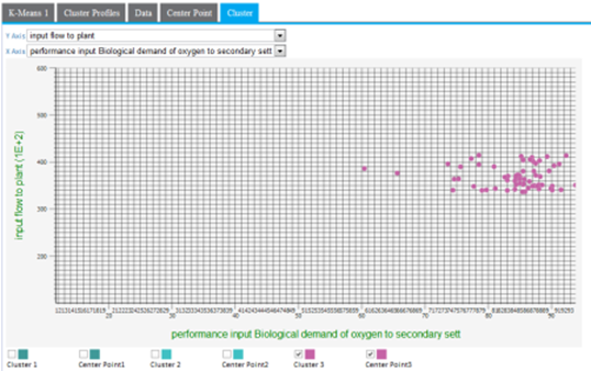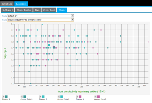 A lot of cluster overlap for two variables might indicate that they are not as significant in the cluster analysis, or that there is not much variation of the overall population for those particular variables. The following example shows a more intermingled cluster visualization when the y-axis dimension is changed from input flow to plant to output pH.