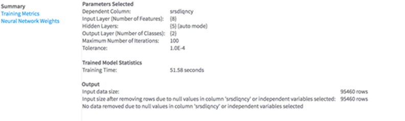 | Compute Classification Metrics on Training Set | Yes (the default) - performance metrics of the model on the input are displayed in the output Tab Training Metrics. The model accuracy is provided as well as for each label to predict the associated recall, precision, and F1 measure. |