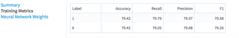 Training Metrics (This tab is displayed only if the option Compute Classification Metrics on Training Set was set to Yes):