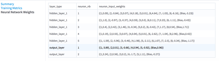 This table provides the final input weights of each neuron of the network. The neuron_input_weights column is shows a list of all neurons connected to the neuron neuron_nb of the layer layer_type, with their associated weight (for example, (1, 0,09) means a weight of 0.09 associated with neuron 1 of the previous layer).