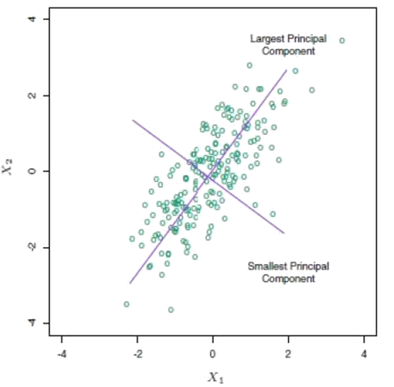 - The following figure shows the principal components of some data points in two dimensions. The largest principal component runs along an axis that shows the greatest variation of the data and would represent the first principal component. The smallest principal component shows the least data variation.
