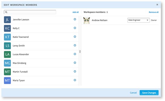 - Add and edit members: A list of currently existing members is displayed on the left side of the dialog, while the current workspace members are on a list on its right side. Click + next to a person's name to add them to a workspace. You can also edit their workspace role from this dialog.