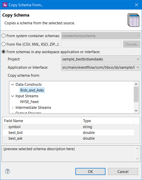 Use the Copy Schema From dialog to insert an existing schema into the Fields grid of an Edit Schema tab in the Properties view. Copy Schema From is also available for arcs when StreamBase cannot automatically determine the schema to use (such as when there are multiple arcs between two components). Unlike the command, Copy Schema does not specify a schema format.