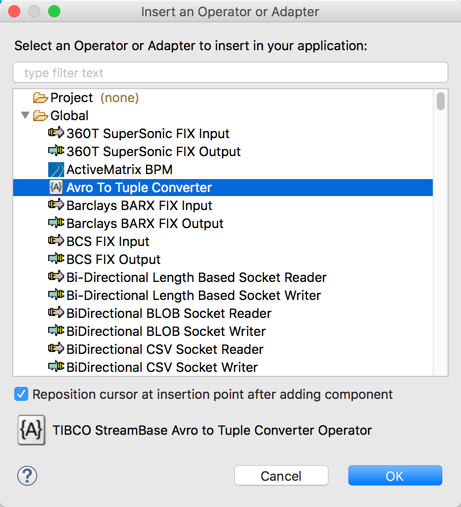 The Reposition cursor at insertion point option is selected by default. This allows you to immediately click to select the newly dropped adapter and show its Properties view. If you are adding several adapters with different search strings, unselect this option so that the cursor remains in the dialog.