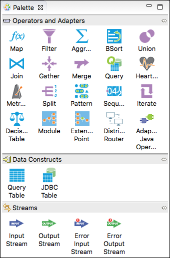 The Palette view is displayed when you have an EventFlow module open in the EventFlow Editor. By default, it opens in the lower left corner of the SB Authoring perspective, but as an alternative, the Palette can be docked inside the EventFlow canvas. The Palette provides easy access to EventFlow components, which you drag and drop onto the canvas to add to your module.