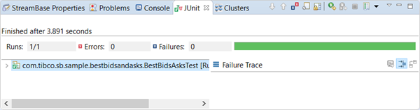 Success or failure is shown in the Console and JUnit views, which share the bottom pane of the SB Authoring perspective. In the JUnit view, a successful run shows with a long green bar and statistics, like the following example: