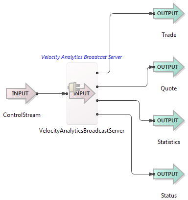 This section demonstrates how to use the Velocity Analytics Broadcast Server Input adapter in a StreamBase application, and describes the use of the adapter's ports. By default, the adapter provides one output port. As shown in the EventFlow diagram below (from one of this adapter's sample applications), the adapter can communicate with the surrounding application by means of one optional input port, a configurable number of output ports, plus a optional status output port. As with other StreamBase adapters and operators, you can optionally enable an Error Output Port.