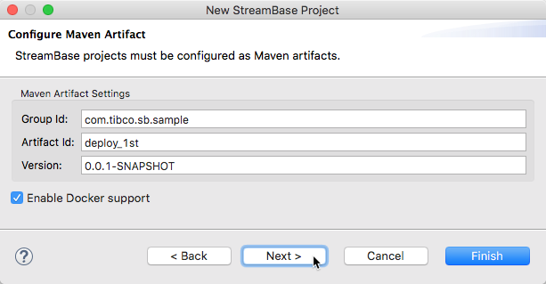 com.tibco.sb.sampleto match the Group ID of the fragment sample as determined in step 1. (You are not required to use the same Group ID for a StreamBase Application project as for its dependent fragment projects, but doing this brings clarity to the process.)Select the Enable Docker support check box. This is the entire difference between building an application that runs locally and one that runs in a Docker container.