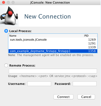Start JConsole by typing jconsole in a StreamBase Command Prompt or type jconsole & in a macOS or Linux Terminal window on the same machine running your EventFlow fragments. JConsole starts with a dialog that
