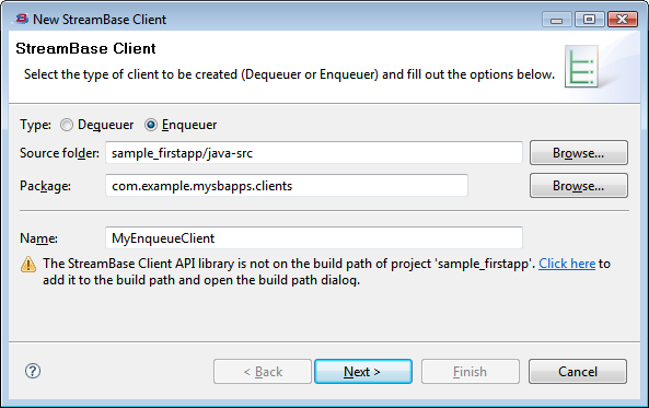You can use the StreamBase Client wizard to create a Java client enqueuer or dequeuer program that will interact with a StreamBase application. The generated code has commented sections that you can later edit to add the functionality you want. When you want to deploy the client to use with your StreamBase applications, you can package your code into a JAR file and export it to your file system.