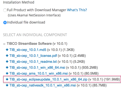 On the TIBCO eDelivery download page for TIBCO StreamBase software, select the Individual file download method.