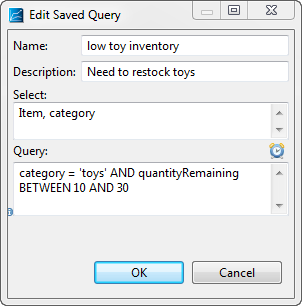 You can edit this query by right-clicking on it and selecting from the drop-down menu. For example, you can change the query name, add a short description, and limit the query to a range between 10 and 30 for quantityRemaining.