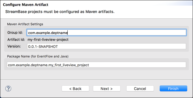 com.example.deptnamein the Group Id field. (If your site already has a standard Group ID for Maven projects, you can use that name instead.)Notice that the Package Name field is automatically generated by combining the Group ID and the Artifact ID, which is the same as the Project Name you specified in step 3. Hyphens in the Artifact ID are changed to underlines, according to Java and Maven package name standards. Do not change the Package Name.
