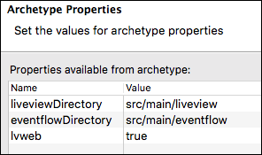 To control this, click twice in the wizard to get to the Archetype Properties panel. As shown in the following example, the default setting of the lvweb property is true.