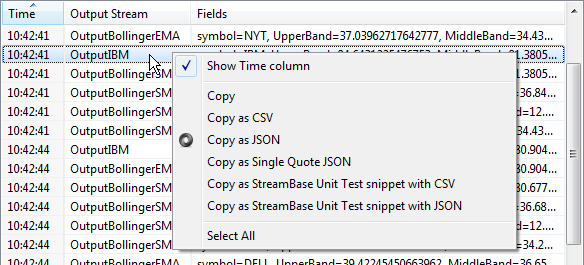 The selected rows are copied to the clipboard as a comma-separated value string, using the CSV standard rules. The Time column's value is included or not, depending of the setting of the Show Time column option. When used in the Input Streams view, this option generates a string that can be sent to the specified input stream using sbc enqueue or using a custom client application.