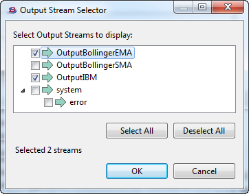The following illustration shows the Output Stream Selector dialog for two cases of running the Bollinger Band sample installed with StreamBase.
