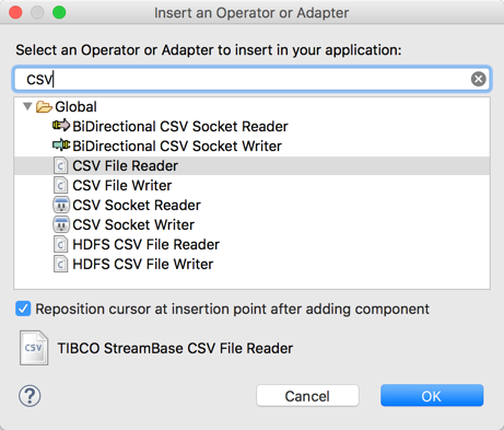 The Insert an Operator or Adapter dialog can also be used efficiently with keystrokes only. For example, to insert a CSV File Reader adapter icon, with an