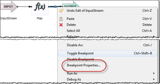 As with Hit Counts on Java Breakpoints, you can specify a Hit Count on an arc breakpoint to delay suspension at that arc until a specified number of tuples have traversed (that is, hit) that arc. To specify a hit count, first set the arc breakpoint: right-click an arc and select Toggle Breakpoint. Then in the Breakpoints view, select the corresponding breakpoint, right-click and select Breakpoint Properties. The dialog that appears lets you enable the option, and lets you specify the count. During debugging, if that count is reached, the debugger disables the option for that breakpoint.