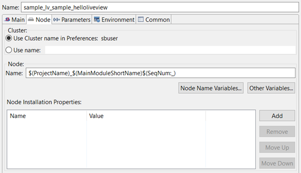 Settings made in this tab can only affect the next node that Studio installs and starts. Remember that Studio installs a node and reuses it for the next launch of the same fragment. So even though this tab is part of the configuration for one LiveView fragment, if you add or change environment variables in this tab, for them to take effect, you must stop and remove any existing node for this fragment using toolbar buttons in the Clusters view. Then at the next launch of this configuration, Studio installs and starts a new node with the new environment settings.