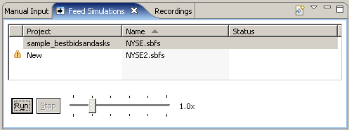 To run the NYSE.sbfs feed simulation, select it and click the button. Another way to start it is to right-click the feed simulation file name, and select Run Feed Simulation from the drop-down menu.
