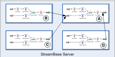 In the next diagram, we add two writer modules (B and C) to a running engine that was already hosting module A. Then we added module D to write its output stream to the output stream of module A.