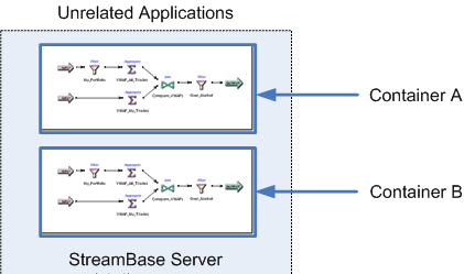 StreamBase containers are the building blocks for organizing and connecting a complex EventFlow fragment. There is one EventFlow module per container, and each container name serves as a handle for that module's resources. Multiple containers and modules can be run in a single EventFlow or LiveView engine process, and you can share resources between containers.