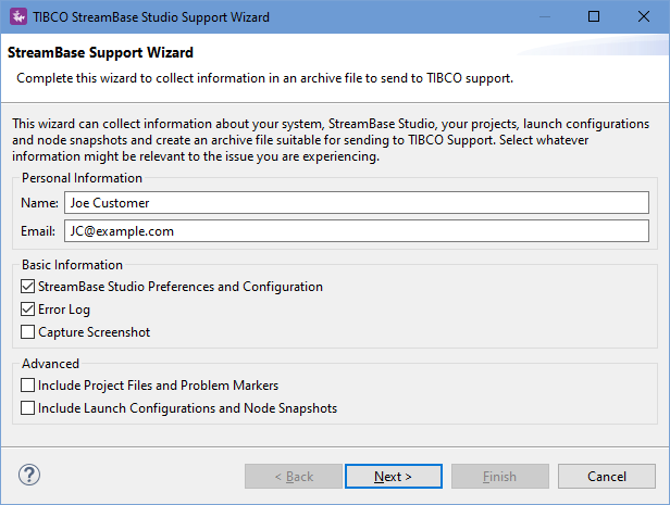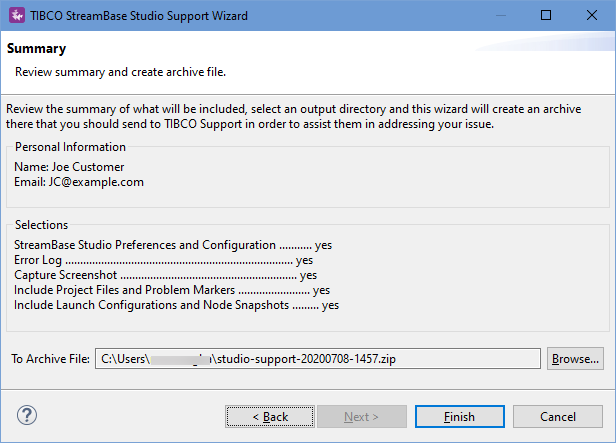 The StreamBase Support Wizard presents a dialog to capture relevant information for your system and applications, and bundle it into an archive (.zip) file. Once bundled, you can send the file to TIBCO Support per local practice.