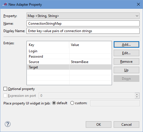 An adapter property is a Java property for your adapter. For each property you specify, the wizard generates code to place a control in the Adapter Properties tab of the Properties view for your adapter. After you add implementation code to the generated stub code, the end-user of your adapter can use these controls to modify the operation of your adapter.
