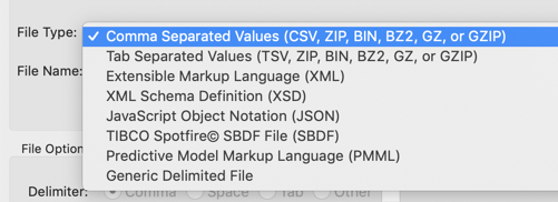 Select a CSV or TSV file from the workspace or file system. For these two file types, Studio can also import from an archive file that contains exactly one CSV or TSV file. Supported archive formats are Zip, BZip2, and Gnu Zip.