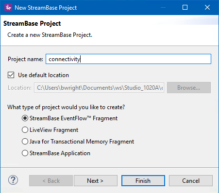 By default, StreamBase Studio creates your project in your current Studio workspace, which is the recommended location.