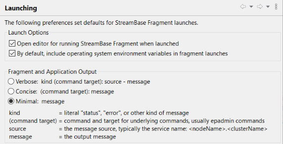 | Open editor for running StreamBase Fragment when launched | When launched, the EventFlow Editor opens in the SB Test/Debug perspective for the EventFlow module selected to be run. | Enabled |