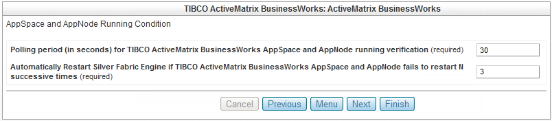 - Polling Period (in seconds) for detection of TIBCO ActiveMatrix BusinessWorks AppNode or bwagent running verification (required)