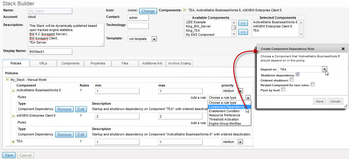 Tip: For easy scalability one should add one component with TIBCO ActiveMatrix BusinessWorks configured to run as an Enterprise Environment with the Agent (bwagent) running as a server, and one component TIBCO ActiveMatrix BusinessWorks configured to run as an Enterprise Environment with the Agent (bwagent) running as a Client. The BW Client component can be scaled up to run on more engines or de-allocated based on application demand and your archive scaling rules.