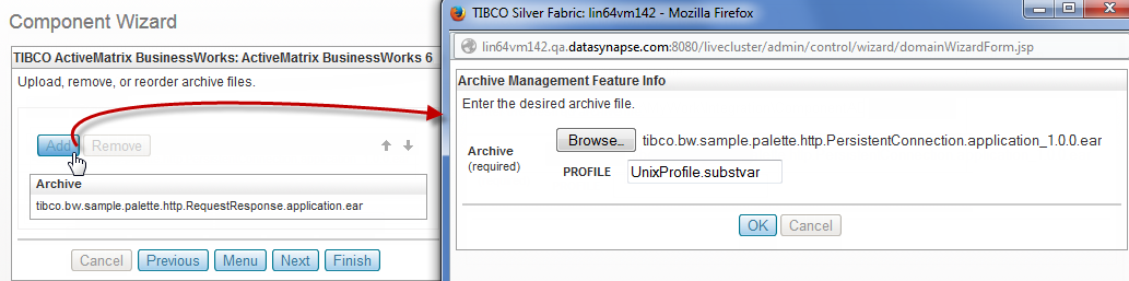 If you want TIBCO Silver Fabric Enabler for BusinessWorks components to publish and run one or more BusinessWorks projects, upload one or more archive files (EAR or ZIP files) as follows: