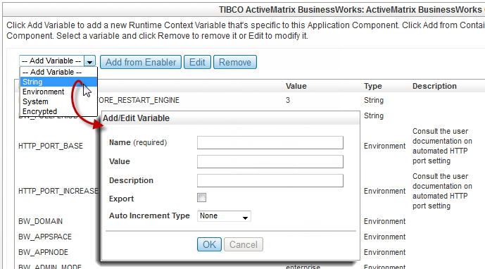 The string, environment, system, or encrypted variables may be added to the component to define and set runtime-specific context variables.