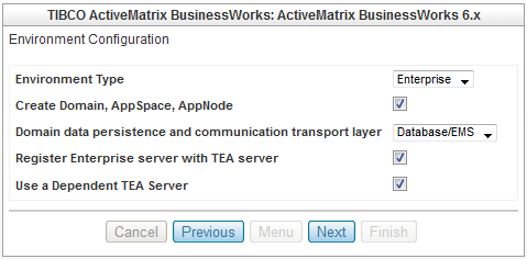 Selecting this option creates a TEA component for TIBCO Silver Fabric Enabler for TIBCO Enterprise Administrator and also sets the dependency of BusinessWorks component on the TEA component. TIBCO BusinessWorks component then acquires the URL of TEA server and automatically registers to the TEA server.